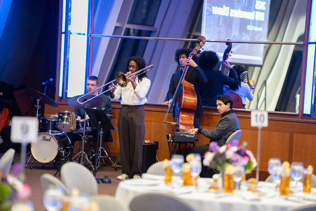 The event took place at the Kimmel Center’s Rosenthal Pavilion, beginning with a reception featuring passed hors d’oeuvres and live jazz performed by NYU musicians, followed by a celebratory dinner. Stacie Bloom, NYU’s chief research officer, vice chancellor, and vice provost for global research & innovation, opened the evening with remarks highlighting the University’s continued momentum. She was followed by Marc Sedam, vice president of Technology Opportunities & Ventures, who shared an overview of NYU’s commercialization achievements over the past fiscal year. Together, they then led the ceremony honoring 2025 contributors, including first-time innovation disclosers, innovators of licensed technologies, and innovators listed on issued U.S. patents.